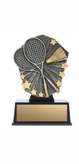 The Cosmo badminton trophy is constructed using a resin material and is detailed in a painted finish.