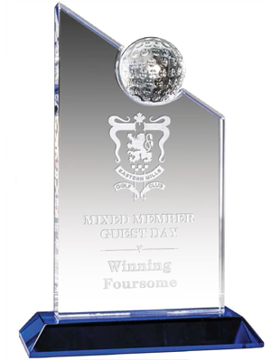 The Golf Angled Crystal Glass Award is reverse laser-engraved for a finely detailed image. |