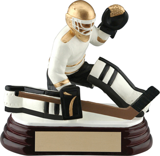 The Goalie award is constructed using a resin material and is detailed in a painted finish with gold detailing. Commemorate your season with these beautifully designed resin trophies.