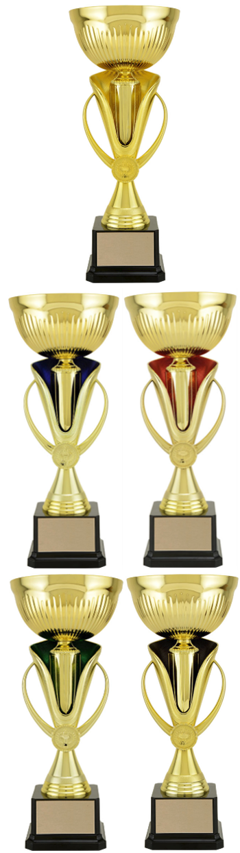 Cup is gold available with blue, red, green, black or yellow accents.