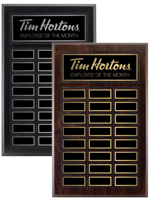 The Grooved Laminate Plaque can be used as an annual plaque with a new winner engraved each year, featuring 24 plates. This is a perfect plaque for celebrating achievement or victory.
